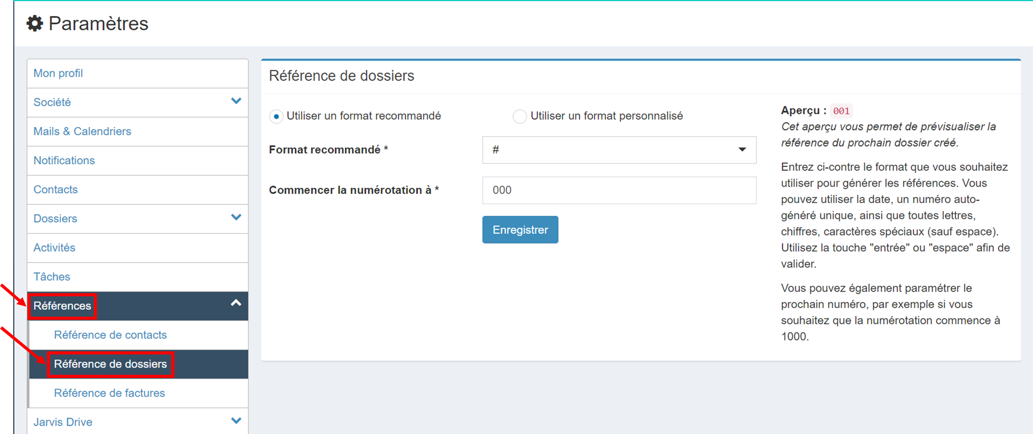 Lors de la configuration de votre espace Jarvis, il vous faudra définir les références de vos dossiers par défaut.